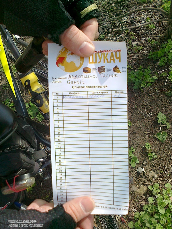 15 апреля 2013 года во время прикатки нового маршрута нашли этот тайник с племянником Вадимом. Очень понравилась идея таких закладок. Искать было интересно, найти - приятно. Спасибо автору за тайник!
