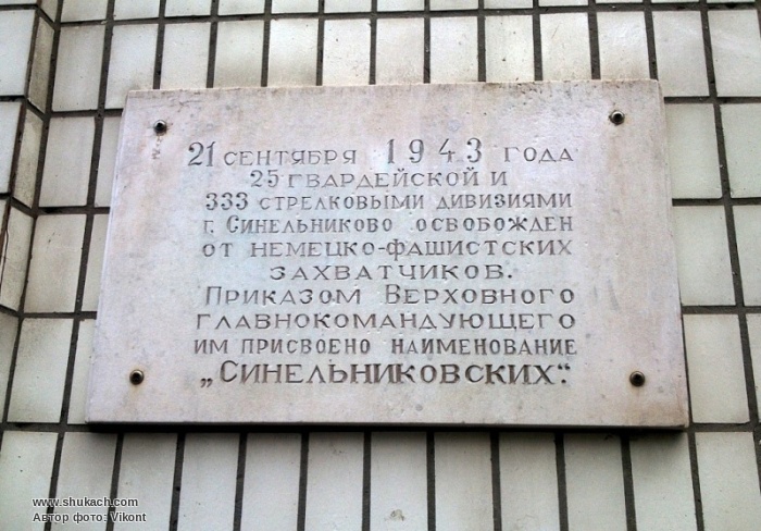 Мемориальная доска в честь освобождения г. Синельниково от фашистских захватчиков.