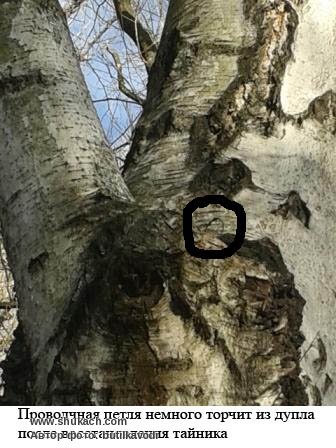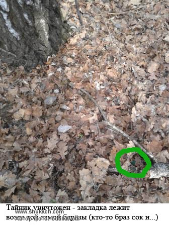 Тайник был разрушен, возможно, собирателями сока (выше тайника была привязана банка). Восстановлен в прежнем виде.