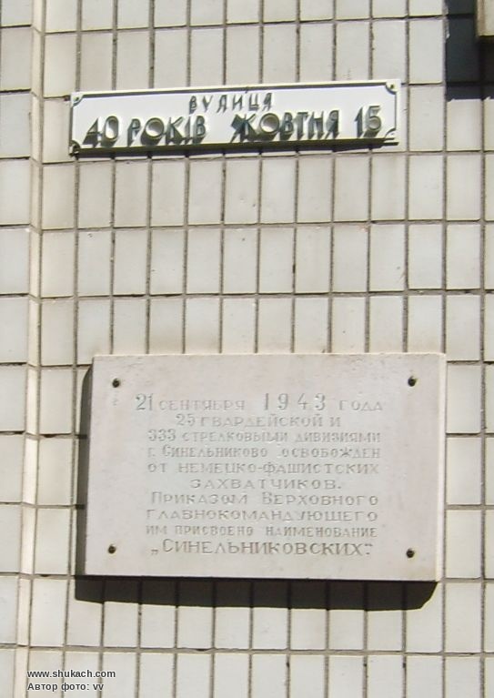 Мемориальная доска в честь освобождения г. Синельниково от фашистских захватчиков.