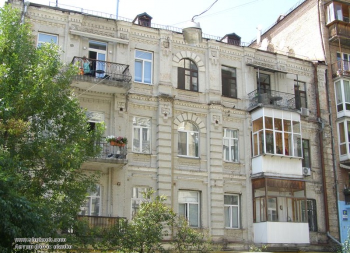 Композиція оформленого у стилі неоренесанс чолового фасаду симетрично-осьова. Центральну розкріповану його частину фланковано рустованими пілястрами, акцентовано півциркульними вікнами третього і четвертого поверхів з профільованими архівольтами. Вертикальні членування фасаду доповнюють два ряди балконів (частково засклені, автентичні ажурні огородження втрачені). По горизонталі фасад членують профільовані міжповерхові гурти та доповнений смугою сухариків карниз третього поверху. Фланковані пілястрами прямокутні віконні прорізи підкреслено підвіконними фільонками з ліпленим рослинним орнаментом. Оформлення четвертого поверху дещо відрізняється від нижніх. Будинок – зразок прибуткової житлової споруди доби історизму.