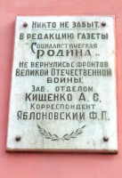 В г.Харцызске на здании редакции местной газеты «Родина», расположенной по улице Вокзальной, 70, установлена памятная доска А.С.Кущенко и Ф.П.Яблоновском