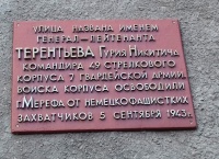 В начале ул. Генерала Терентьева, возле школы № 2 установлена стела с памятной доской генералу Терентьеву Г.Н.