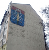 На торцевой стена здания на ул. Полтавский Шлях, 67, обращенной в сторону путепровода Магомета Караева, размещена мозаика (герб г.