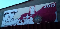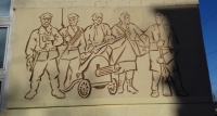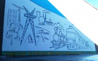Барельефное банно по штукатурке, посвященноё 100-летнему юбилею локомотивного депо "Октябрь" в г. Харьков создано на одной из стен депо.