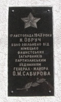 Памятная доска сообщает о том, что 17 ноября 1943 г. Овруч был освобождён от немецко-фашистских захватчиков партизанским соединением генерал-майора А. Н.