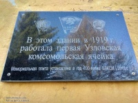 Мемориальная доска первой комсомольской ячейки установлена на здании военного комиссариата по площади Советской, 2 (по другим данным - 4) в городе Узловая Узловского район