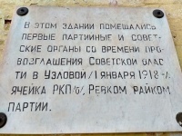 Мемориальная доска первым партийным и советским органам установлена на здании военного комиссариата по площади Советской, 2 (по другим данным - 4) в городе Узловая Узловского ра