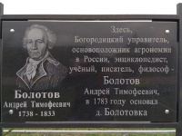 Мемориальная доска основоположнику агрономии в России, писателю, учёному, философу Андрею Тимофеевичу Болотову установлена на металлоконструкции в деревне Болотовка Узловского р