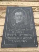 Мемориальная доска Герою Советского Союза Алексею Петровичу Жижкуну установлена на здании детско-юношеской спортивной школы на углу улиц 1 Мая и Жижкуна в городе Городня Городня