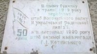 Аннотационная доска, посвящённая штабам Волочиского полка 2-й Украинской советской дивизии и отдельной кавалерийской бригады Г. И.