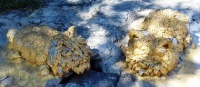 На початку пішохідної зони Пейзажної алеї, на кам'яному паркані розмістилися два маленьких собачки.