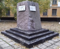 Памятный знак, посвященный 200-летию Донбасса, находится справа от главного корпуса Лисичанского государственного горно-индустриальн