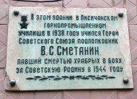 На фасаде одного из корпусов Лисичанского профессионального горно-промышленного лицея (пр-т Победы, 136) установлена памятная доска Сметанину В.С.