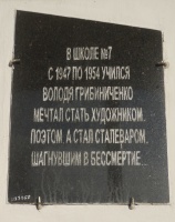 В г.Макеевке на здании общеобразовательной школы № 7, расположенной по улице Циолковского, 2, установлена памятная доска В.К.Грибиниченко (1939-1964), ко
