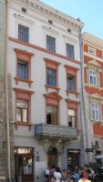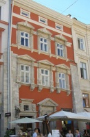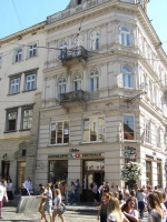 Будинок наріжний, головним фасадом виходить на пл. Ринок, 22, бічним видовженим — на вул. Галицьку.