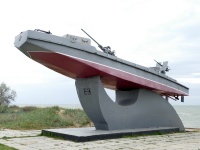 На постаменте в поселке Героевское установлен мотобот времен Отечественной войны. На табличке подпись: