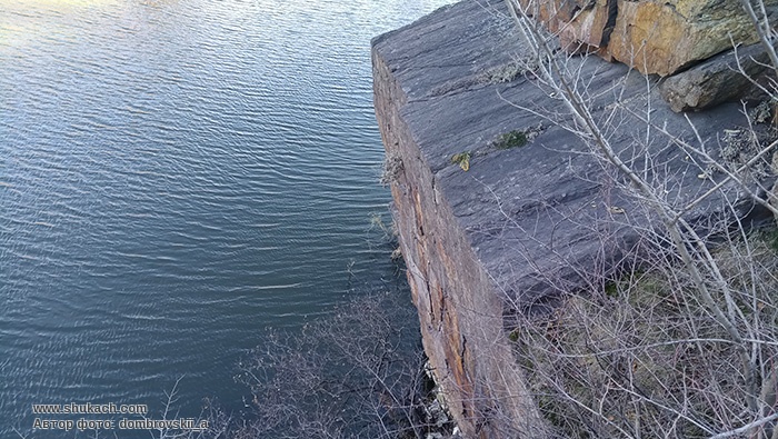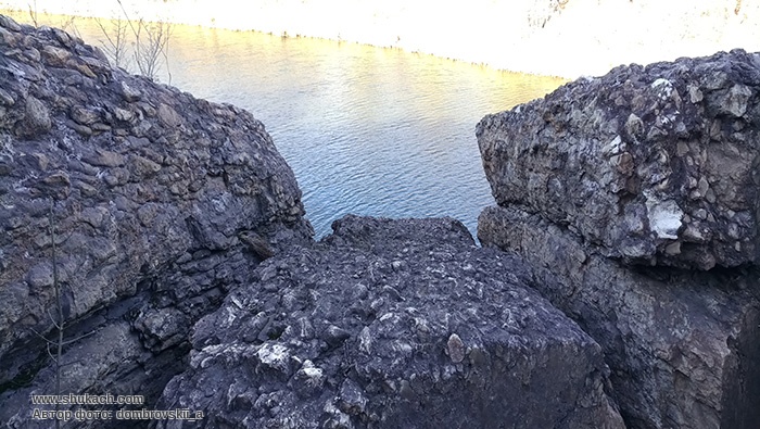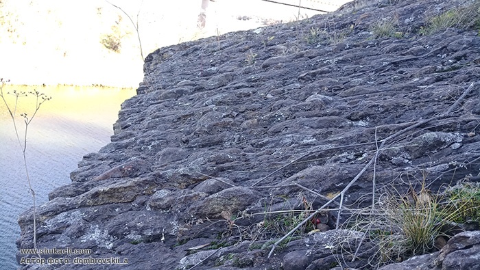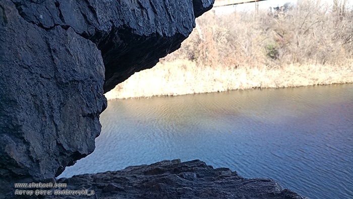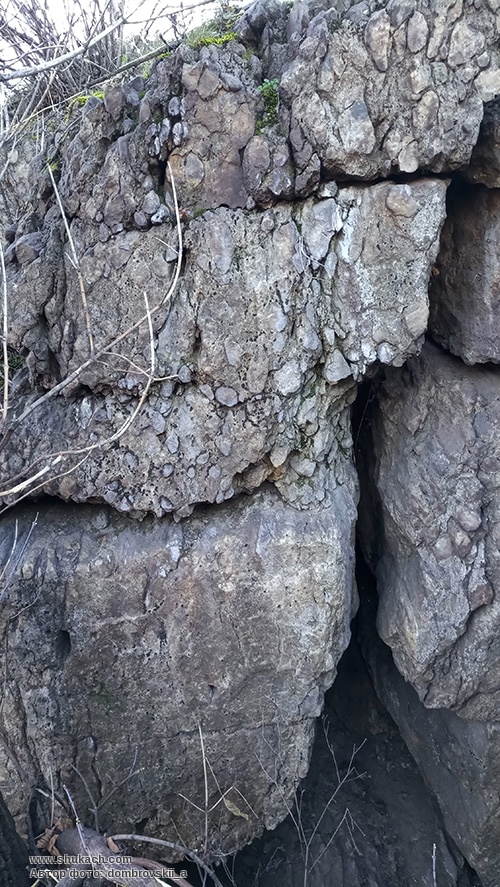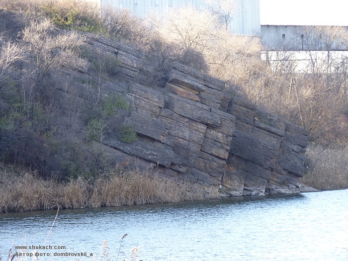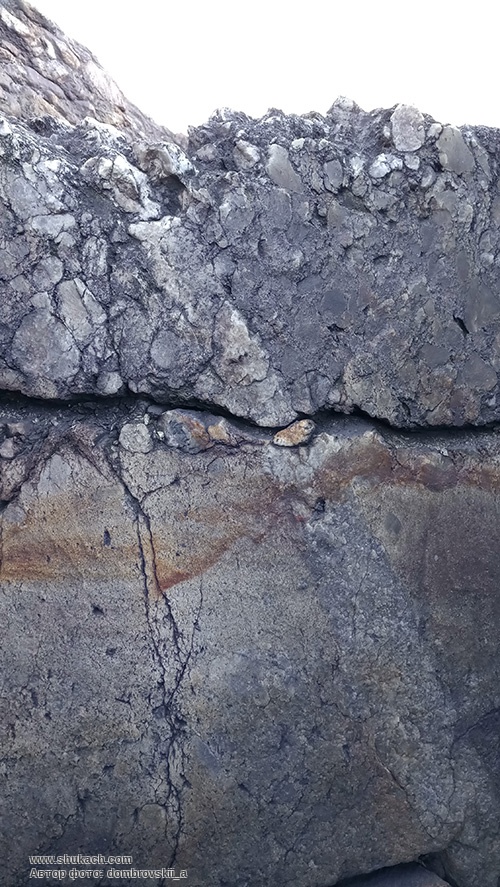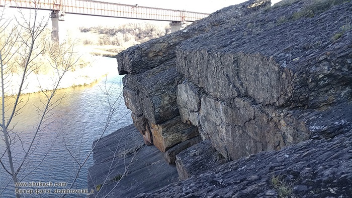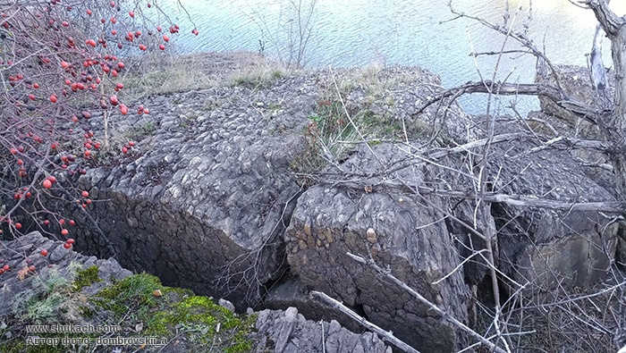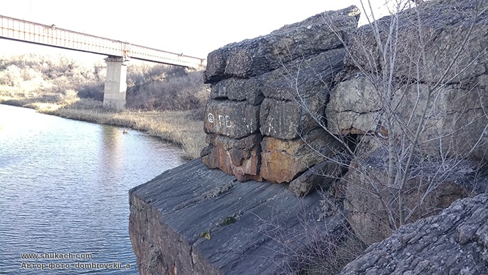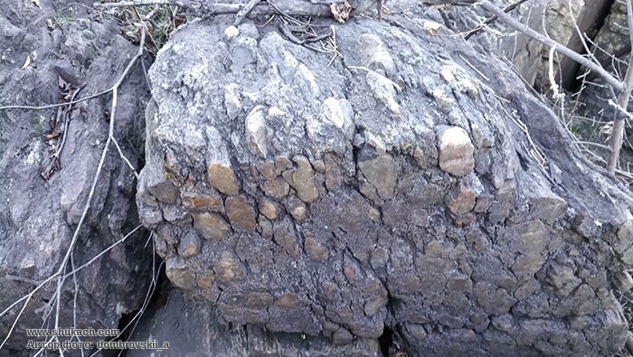 Скала Конгломерат на реке Ингулец в г. Кривой Рог. Очень интересный объект для альтернативщиков. Погож на "бетон", смесь большой гальки. Есть большие ровные расколы, как будто «лазером» разрезали, что цемент с галькой остался одним целым. Если присмотреться, то видно, что галька с цементом имеет глубину 1 – 1,5 м. над гранитом.