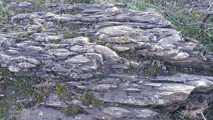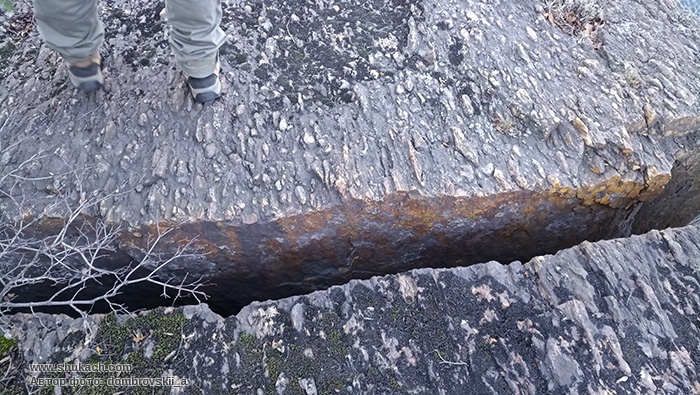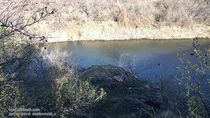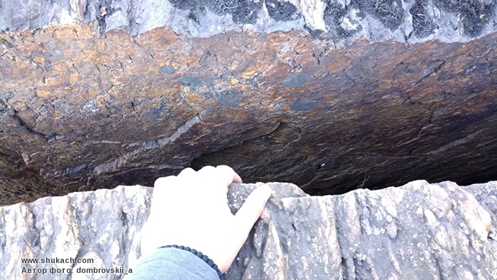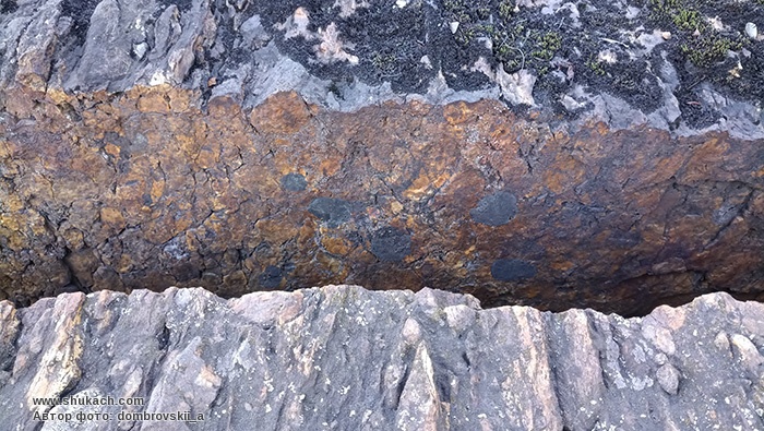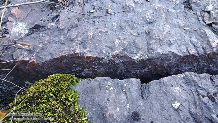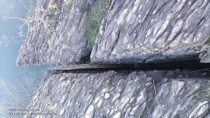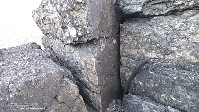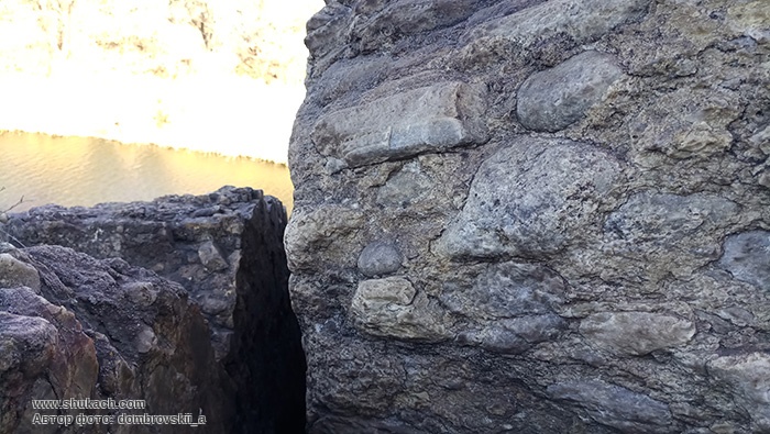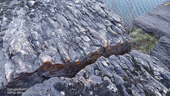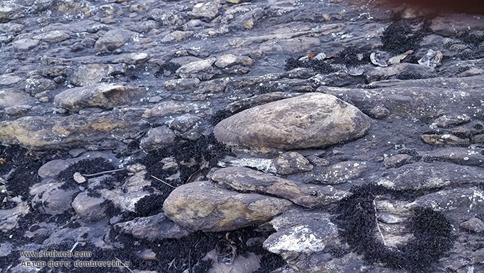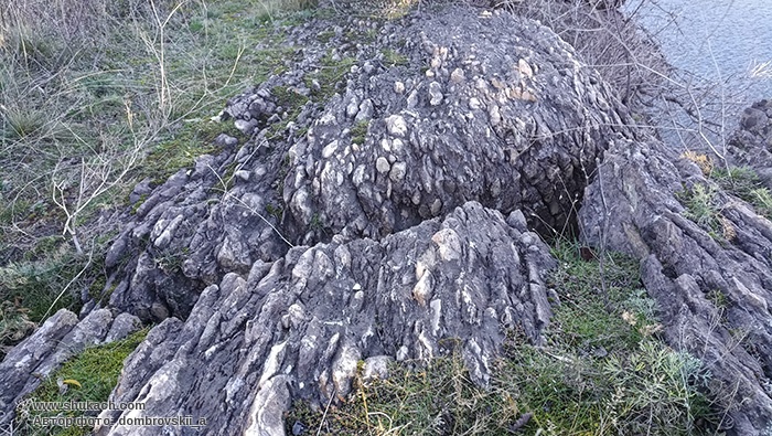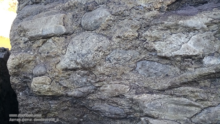 Скала Конгломерат на реке Ингулец в г. Кривой Рог. Очень интересный объект для альтернативщиков. Погож на "бетон", смесь большой гальки. Есть большие ровные расколы, как будто «лазером» разрезали, что цемент с галькой остался одним целым. Если присмотреться, то видно, что галька с цементом имеет глубину 1 – 1,5 м. над гранитом.