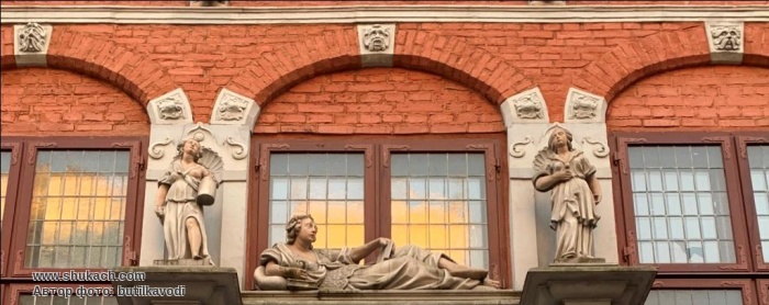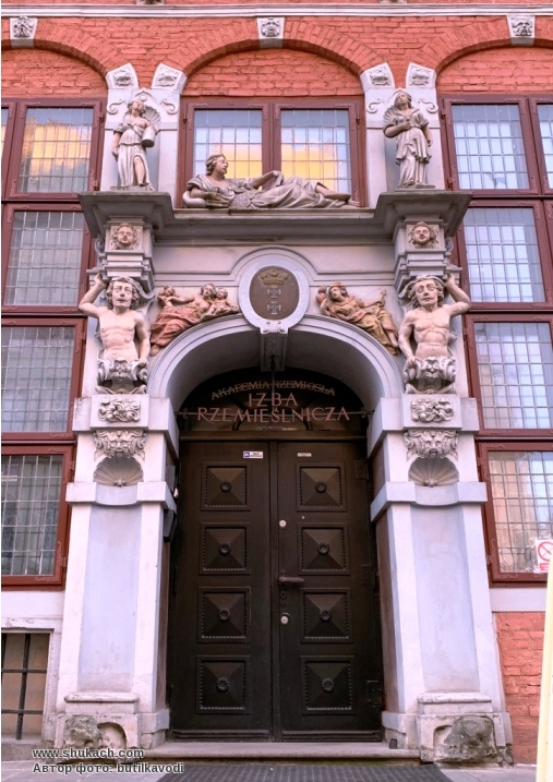 Фронто крыши украшена узорами в виде раковин и растений. Он увенчан фигурой льва, стоящего на задних лапах, а передней поддерживающий каменный шар, который, вероятно, относится к гербу Эндена. Богатый портал с ранними барочными формами украшен фигурами атлантов и дургими скульптурами, вероятно, олицетворящих добродетели. Фасад разделен на три яруза узкими фризами, украшенными головами в тюрбанах и лавровых венками. Наиболее важными декоративными мотивами являются каменные медальоны, расположенные в несколько линий между окнами: головы Александра Македонского, Геркулеса, польских королей Зигмунта III и Владислава IV, рыцари, мудрецы, представители разных человеческих рас. Возможно, этот декор должен был быть намеком на победоносные бои обоих Вазов против мусульманского противника.