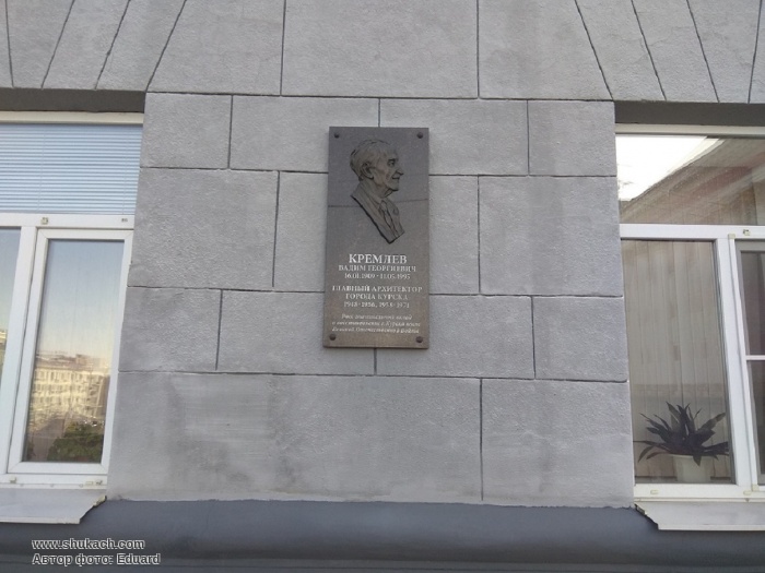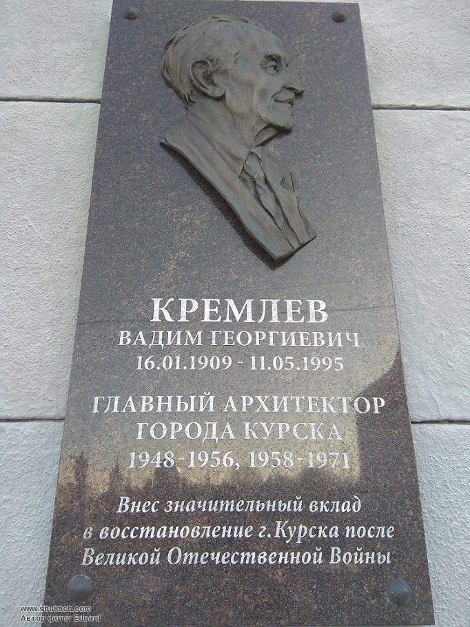 Кремлёв Вадим Георгиевич (16.01.1909, Санкт-Петербург — 11.06.1995, Курск) — архитектор, член Союза архитекторов СССР (1936). Родился Вадим Георгиевич 16 января 1909 года в Санкт-Петербурге. В 1931 году окончил строительное отделение Свердловского строительного техникума. С 1931 года по 1935 год работал прорабом треста "Домгоспром-Урал". В 1932-1936 годах учился на строительном факультете Уральского индустриального института. В