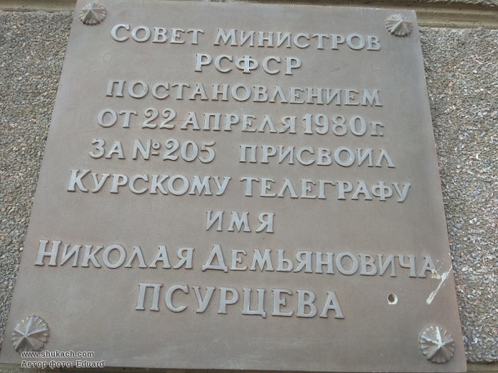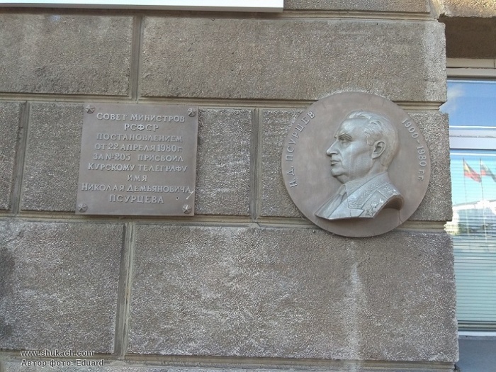 Барельеф советскому государственному и военному деятелю, генерал-полковнику войск связи, министру связи СССР Николаю Демьяновичу Псурцеву и аннотационная доска, посвящённая присвоению Курскому телеграфу имени Псурцева установлены на здании Дома связи по адресу Красная площадь, 8 в Центральном округе города Курск Курской области. Надпись на барельефе: "Н. Д. Псурцев 1900-1980 г.г.". Надпись на доске: "Совет Министров РСФСР постановлением от 22 апреля 1980 г. за №205 присвоил Курскому телеграфу имя Николая Демьяновича Псурцева". Барельеф и аннотационная доска установлены в марте 1982 года. Источник Источник