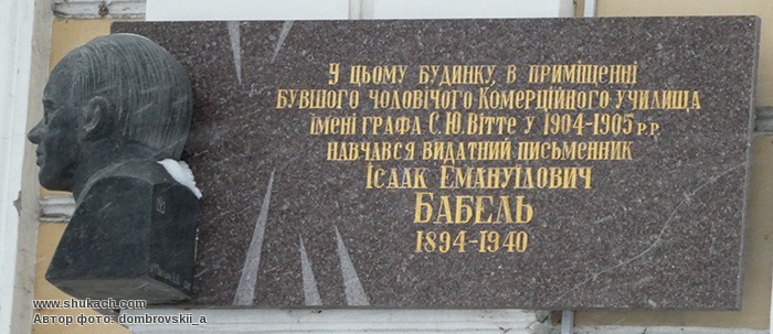 Надпись на доске: В этом здании в помещении Мужского Комерческого училища имени графа С.Ю.Витте в 1904-1905 гг. учился выдающийся писатель Исаак Эмануилович Бабель 1894-1940.