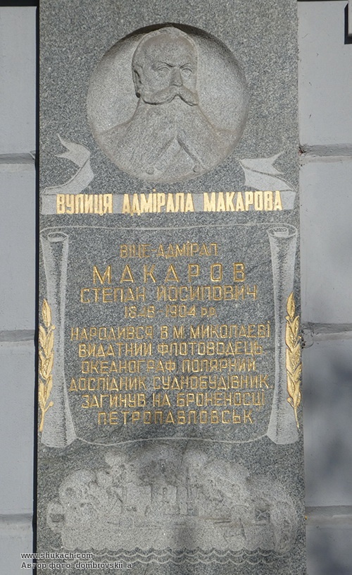 Надпись на доске: Вице Адмирал Макаров Степан Осипович 1848-1904 гг. родился в городе Николаев, видающийся флодоводец, океанограф, полярный исследователь, судностроитель, погиб на броненосце Петропавловск.