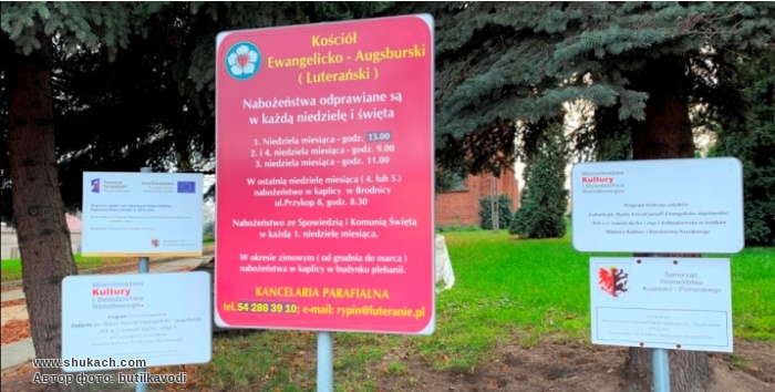 Евангелистский костел Аугсбургского исповедания (лютеранский) в г. Рыпин построен в 1888 г., в так называемом Граде Тамплиеров. Это неоготическое здание, спроектированное Стаппельманном (Stappelmann). Интерьер храма имеет богатую цветную роспись, резной амвон и алтарь из трех частей. В церкви также есть резные скамейки и галереи. На башне храма установлены часы, привезенные из г. Прага (Чехия) в 1911 году.