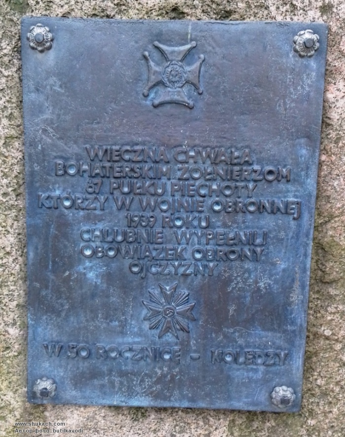 "Вечная хвала героическим солдатам 67 пехотного полка, которые в Оборонительной войне 1939 года славно выполнили долг обороны Отчизны. В 50 годовщину - коллеги".