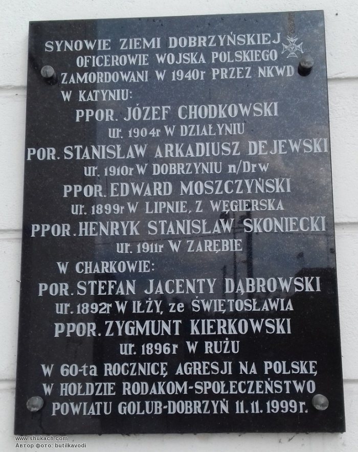 "Сыновья земли Добжиньской офицеры Войска Польского казненные в 1940 г. НКВД в Катыни... в Харькове... В 60-ю годовщину нападения на Польшу в честь земляков - общественность повята Голуб-Добжинь 11.11.1999 г."