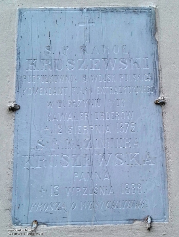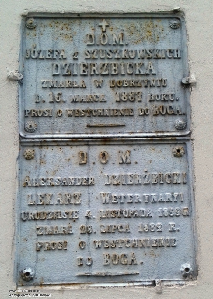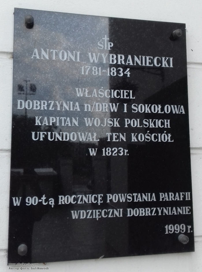 "Антони Выбранецки владелец Добжиня-над-Дрвенцей и Соколова, капитан войска польского основал этот костёл в 1823 г. В 90-ю годовщину основания парафии благодарные добжиняне. 1999 г."