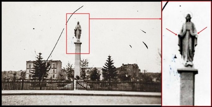 Фото после освобождения Польши от гитлеровцев, на котором стрелками отмечены повреждения скульптуры.