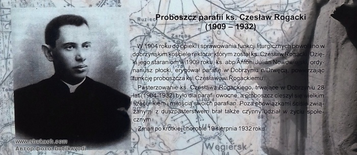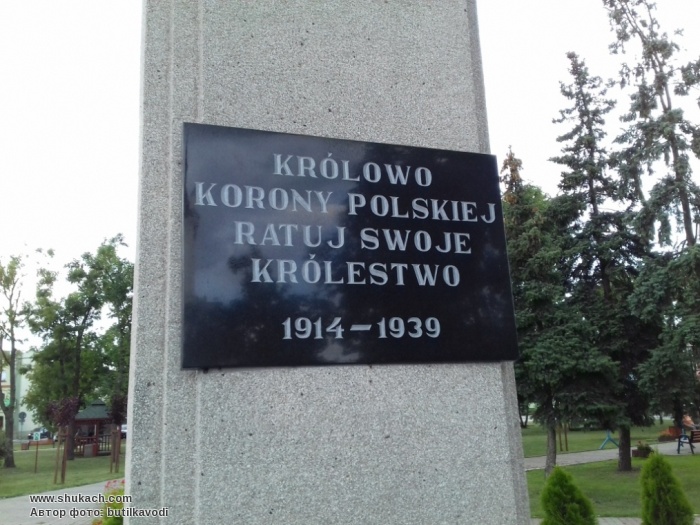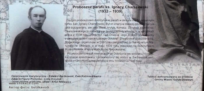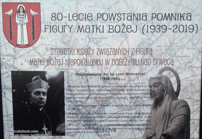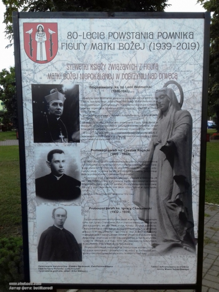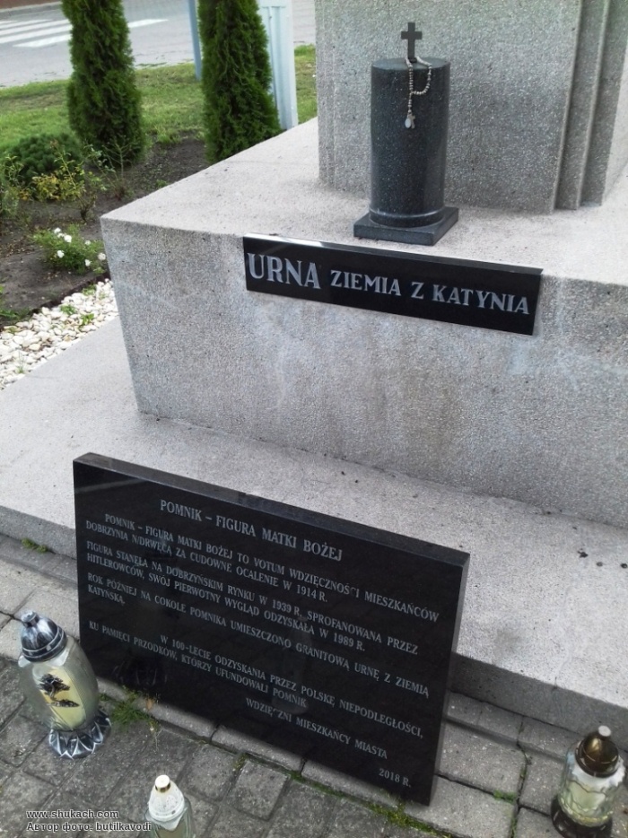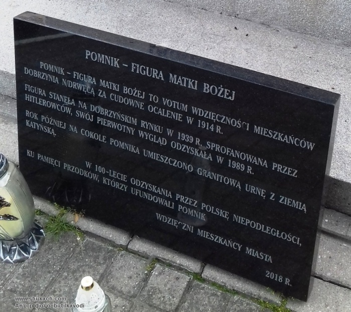 "Памятик - скульптура Матери Божьей - это выражение благодарности жителей Добиня-над-Дрвенцей за чудесное спасение в 1914 г. Скульптура установена на добжиньском рынке в 1939 г., оскверненная гитлеровцами, свой первоначальный вид получила в 1989 г. Годом позже на постаменте памятника размещена урна с катыньской землей. В 100-летие получения Польшей независимости, в память предков, которые создали памятник. Благодарные жители города, 2018 г."