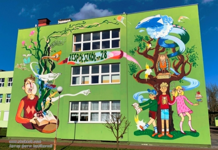Одну из стен здания школы № 28 (ул. Пжи Скарпе, 13 (Przy Skarpie) украшает мурал, темой которой является школьная жизнь и ее значение для растущих людей - детей.