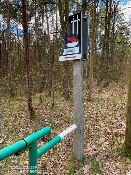 От парковки на дороге к памятнику ведет тропа, начало которой обозначено традиционным в польше знаком мест народной памяти.