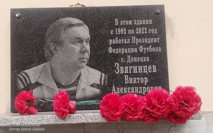 В Ворошиловском районе г.Донецка на доме № 28 по бульвару Пушкина, где расположена городская Федерация футбола, установлена памятная доска В.А.Звягинцеву.