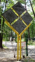 Перед головною брамою, що веде на територію Спортивно-оздоровчого табору "Політехнік" Національного технічного униіерситету "Харківський політехнічний інститут" стоїть