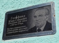 Пам'ятна дошка Гельфанду Юхиму Семеновичу встановлена на головній будівлі Зміївського машинобудівного заводу (вул. Залізнична, 115), який він тривалий час очолював.