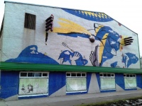 На бічному фасаді (від вул. Визволителів) Палацу спорту Рубіжанського політехнічного коледжу ім. О.Є. Порай-Кишиці Луганського національного університету ім.