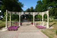Вхід у парк з південної сторони (вул. Центральна) оформлений у вигляді групи колон.