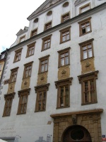 Чотири з корон виглядають практично однаково, вони розташовані в симетричних парах з дещо іншими межами. Центральна має багатшу декоративну рамку, доповнену чотирма кольорами. При виборі архітектурного стилю, в якому згодом проводилася реконструкція, зіграла роль національність архітектора - перевагою став пізній німецько-ренесансний стиль. Дата на красивому порталі зі збереженими дерев'яними воротами визначає рік завершення будівництва - 1615. З лівого боку від входу знаходиться портал з частиною оригінального розписного номера будинку.