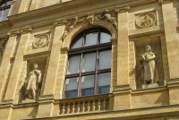 Архітектурна композиція будівлі розділена ні три рівні. Перший рівень виглядає стійким і грубуватим. Фасад першого поверху оброблений класичним рустовочним каменем; вхідні портики зроблені потужними і масивними; у стінах прорізані віконні отвори округлої арочної форми. Другий рівень виглядає легшим – він прикрашений античними скульптурами, іонічними колонами. На третьому рівні майже немає декоративних елементів – він простий і елегантний.