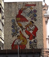 На торцовому фасаді будинка № 26 на вул. Богдана Хмельницького розміщено кольорову мозаїку. Я за сюжетом назвав її "Музики".
