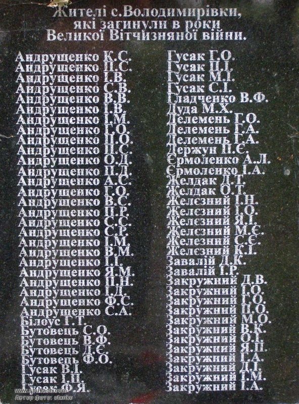 На фронтах Великої Вітчизняної війни і в партизанських загонах з німецько-фашистськими загарбниками билися 445 жителів Володимирівки, з них 227 нагороджено орденами й медалями СРСР. 215 чоловік віддали життя за незалежність Батьківщини. На честь воїнів, які загинули в бою за визволення села, і односельців, що полягли в боротьбі з гітлерівцями, у 1966 році встановлено пам’ятник.