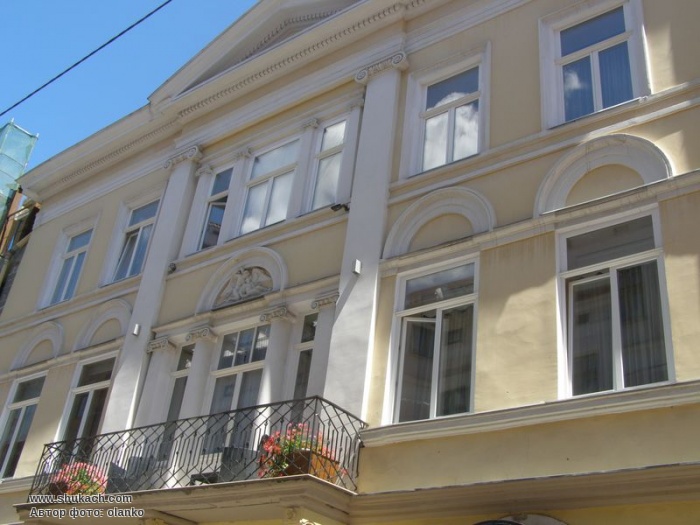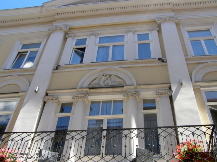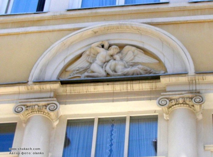 Центральна вісь композиції фасаду додатково акцентована рельєфом "Амур і Психея", розміщеним над балконним вікном (скульптор П. Ойтеле).