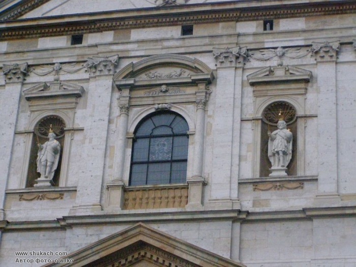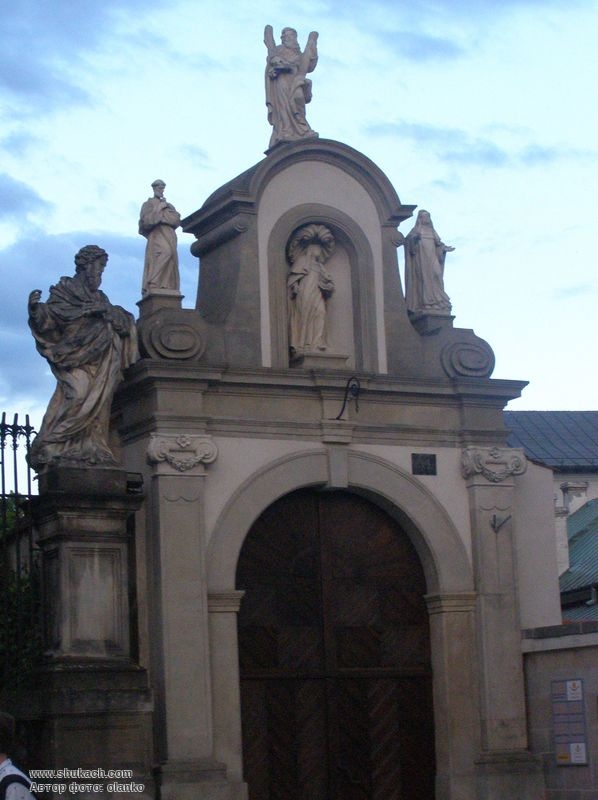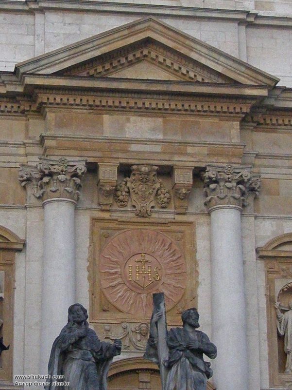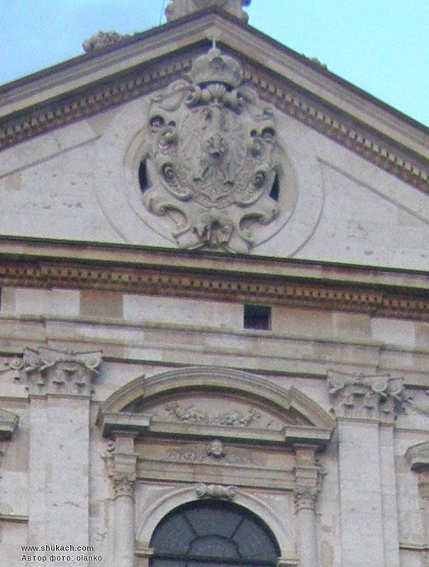 Над головним порталом знаходиться герб єзуїтів, а ще вище - герб короля Зигмунта III. Фігури в нішах на фасаді - це фігури святих.