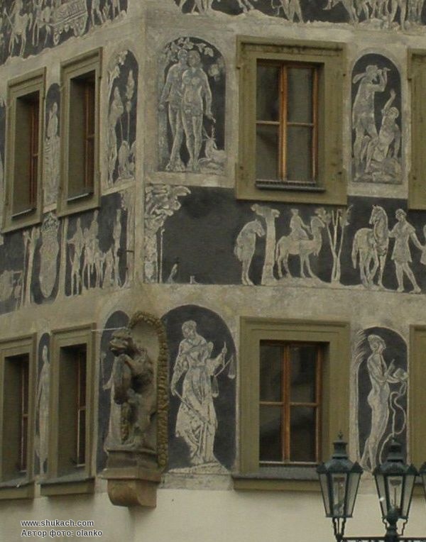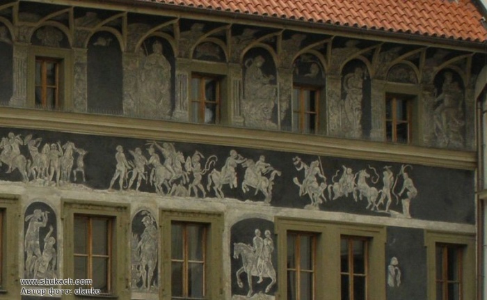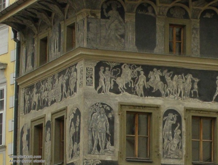 Ці зображення протягом декількох століть були приховані, їх виявили лише в 1919 році при проведенні реконструкції будівлі. Між вікнами розташовані алегоричні фігури, що зображують Мудрість, Справедливість, Стійкість, Материнство і Родючість.