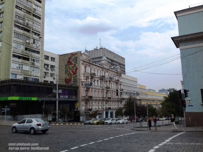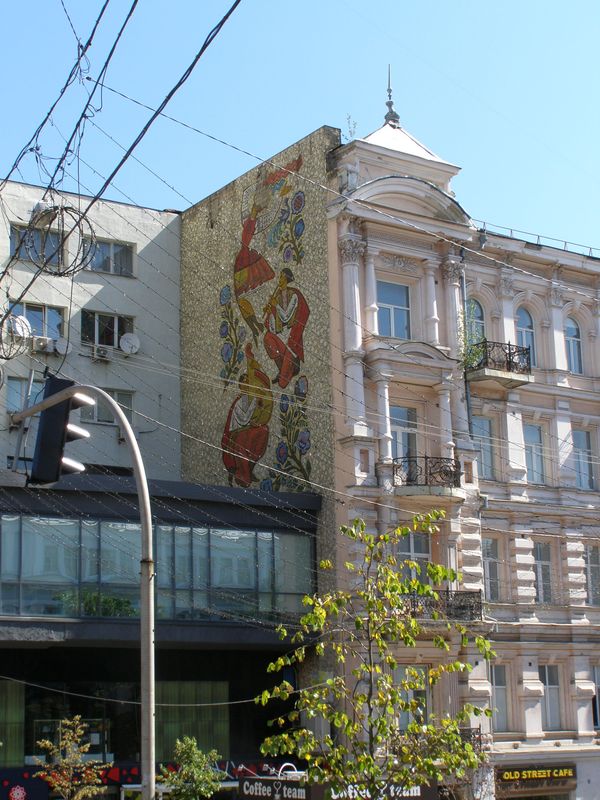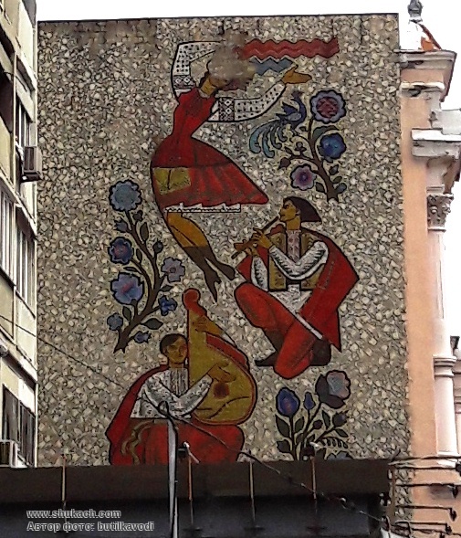 На торцовому фасаді будинка № 26 на вул. Богдана Хмельницького розміщено кольорову мозаїку. Я за сюжетом назвав її "Музики".