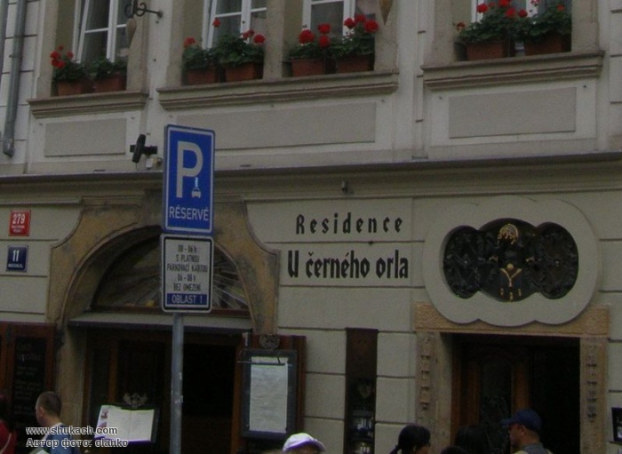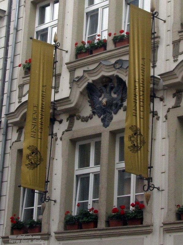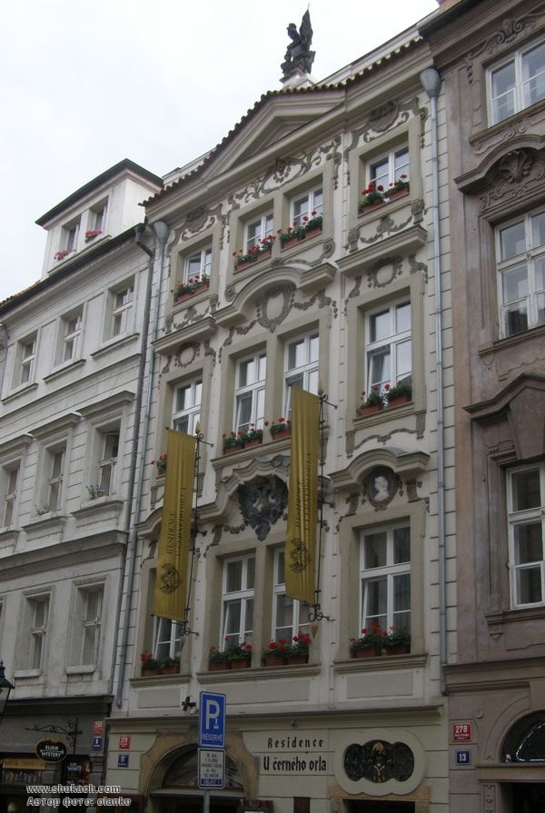 Історія цієї живописної будівлі сходить до середини 14-го століття. Легенда свідчить, що одного дня, коли архієпископ Людвіг Майнц повертався з королівського суду до Праги, один з воїнів його загону врятував орла, застряглого в міжгір'ї скель. І з тих пір птиці захищали загін. У вдячність Майнц розпорядився увічнити образ орла на своїй резиденції. Так на будівлі з'явилася емблема у вигляді орла в короні, з левом на грудях, мечем і скіпетром в кігтях. Будинок неодноразово відновлювався – після пожеж в 1503, 1723 і 1883 роках. В ході реконструкцій були добудовані третій поверх, сарай і льох із склепінчастими стелями. В результаті будинок придбав свій нинішній вигляд.